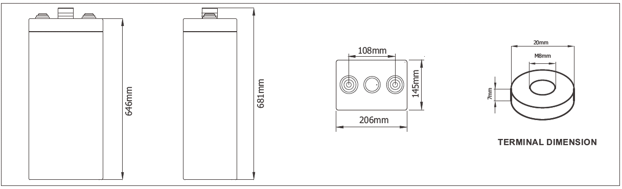 2V 600AH Maintenance free OPzV Battery (Tubular Gel Type) for renewable energy storage, Telecom use, power utilities applications (Deep Cycling Life), L145mm x W206mm x H681mm